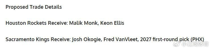 具体的买卖方案:火箭送出奥科吉、范乔丹和2027年太阳首轮选秀权,从国王获得蒙克和埃利斯。